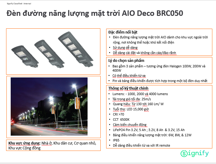 Đèn đường năng lượng mặt trời Deco Solar tích hợp pin lithium ferro phasphate, với bộ điều khiển từ xa và bộ sạc tích hợp trong bộ đèn.